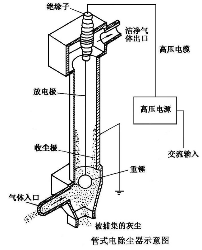 單管電除塵器結構如圖所示。集塵極為150-300mm的圓形金屬管,管長為3-5m。放電極線(電暈線)用重錘懸吊在集塵極園管的中心。管式電除塵器電場強度高且變化均勻,但清灰比較困難。常用于處理含塵氣體量小或含霧滴的氣體。